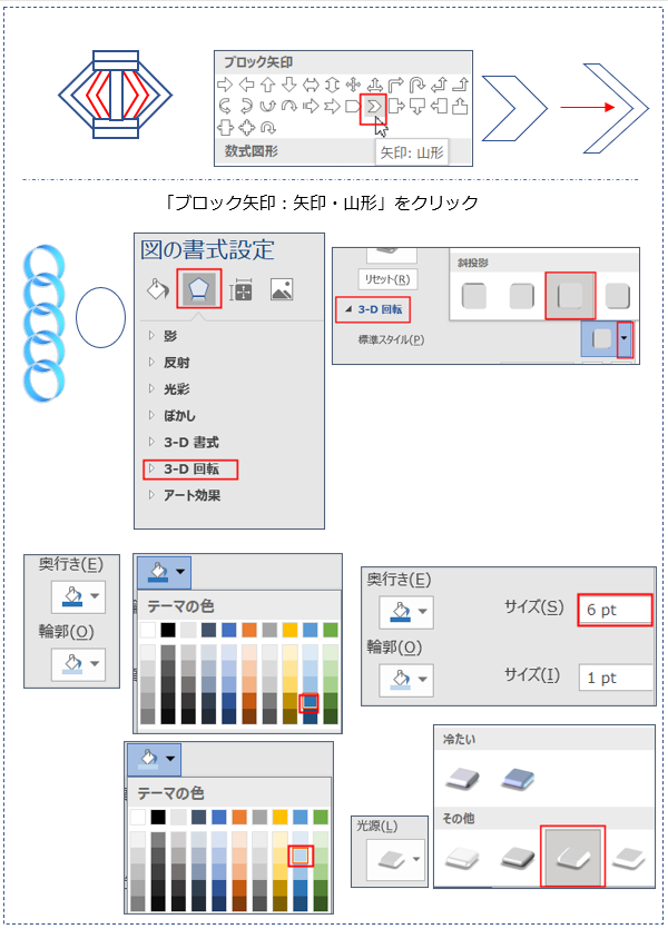 「だ円:塗りつぶしなし」から「3D回転」でいろいろ回転を試してみてください。