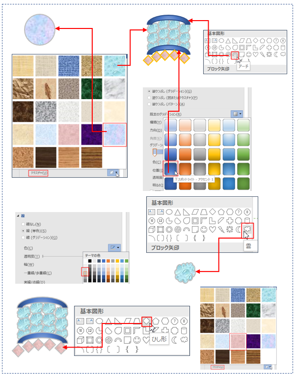 3-2)「だ円・アーチ・雲」に「テクスチャー」などから色を付けます。